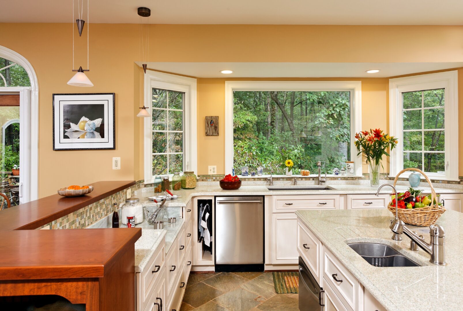 In Clarksville, this remodeled “green” kitchen is a seamless blend of functionality and aesthetics. The centerpiece is a beautiful large square island surrounded by ample white cabinetry, providing both storage and organization. Large windows flood the space with natural light, accentuating the beautiful stone flooring. Additionally, a custom area beneath a bay window allows the homeowner to cultivate herbs and spices right in the kitchen, adding a touch of freshness and personalization to the culinary space.