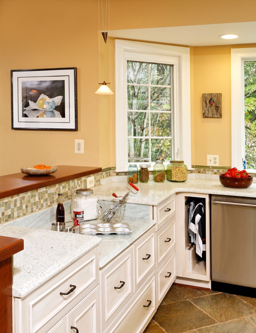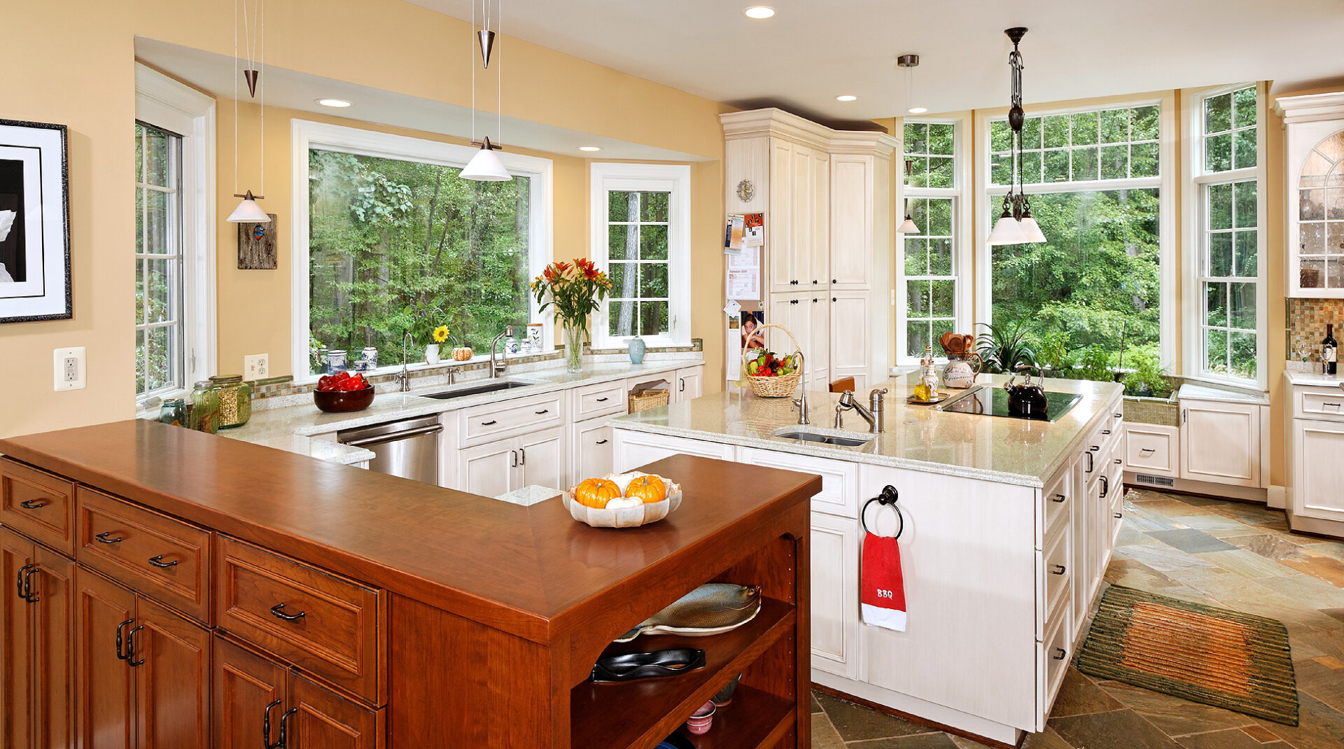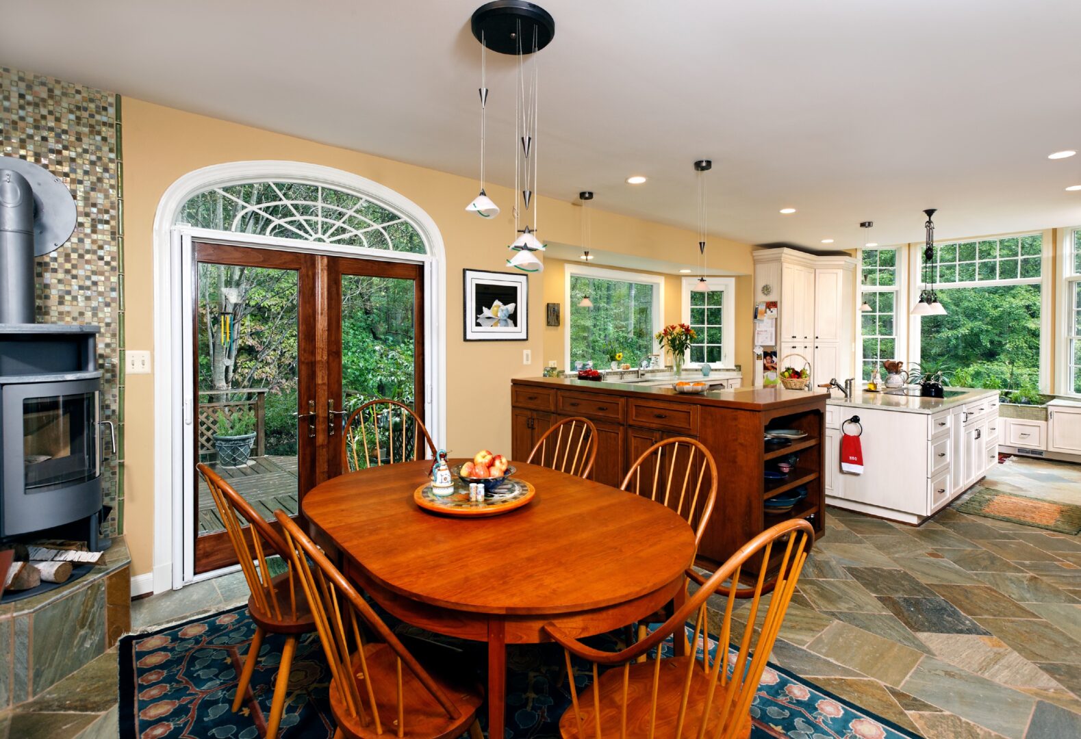 In Clarksville, this remodeled “green” kitchen is a seamless blend of functionality and aesthetics. The centerpiece is a beautiful large square island surrounded by ample white cabinetry, providing both storage and organization. Large windows flood the space with natural light, accentuating the beautiful stone flooring. Additionally, a custom area beneath a bay window allows the homeowner to cultivate herbs and spices right in the kitchen, adding a touch of freshness and personalization to the culinary space.