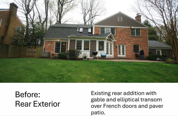 Our design team carefully evaluated the home’s rear elevation and existing roof structure. While there was ample space for a porch addition, the placement of second-story windows required a thoughtful design solution.