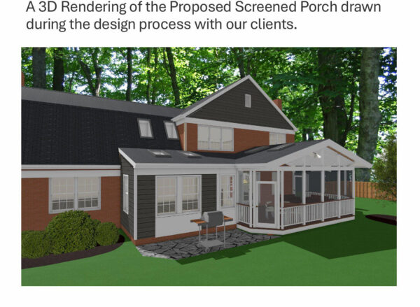 During the design phase, we also created a 3D rendering to help the homeowners visualize the screened porch and understand how it would connect to the home. This collaborative approach ensured the final design met both aesthetic and functional goals before construction began.
