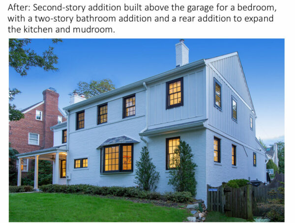 A second-story addition above the garage, creating a new bedroom and bathroom for the homeowners’ daughter