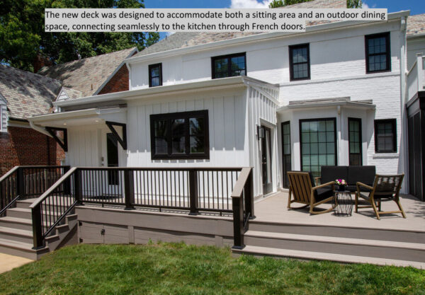To enhance outdoor living, Tabor designed and built a new deck large enough for both dining and lounging, accessed directly from the kitchen through French doors. The existing screened porch was revitalized with new screening, updated trim, and a new door, extending the usability of the outdoor space.